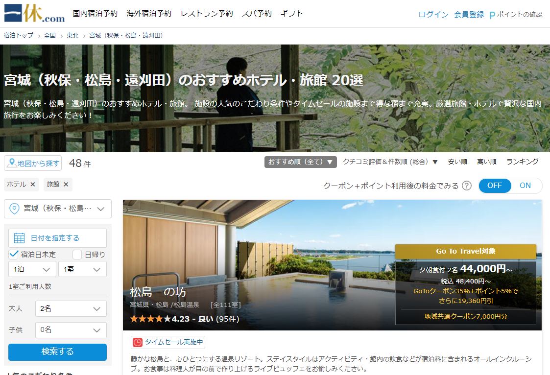さらに楽天トラベルには「楽パッククーポン」「宿クーポン」などの様々なクーポン券があり、gotoトラベルとの併用ができるので宮城県の宿泊・旅行費が35%割引以上にお安くすることが可能です。