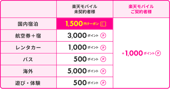 楽天トラベルを各サービス初めて利用する方は最大5,000ポイント、更に楽天モバイル契約者は最大1,000ポイント貰うことができます。